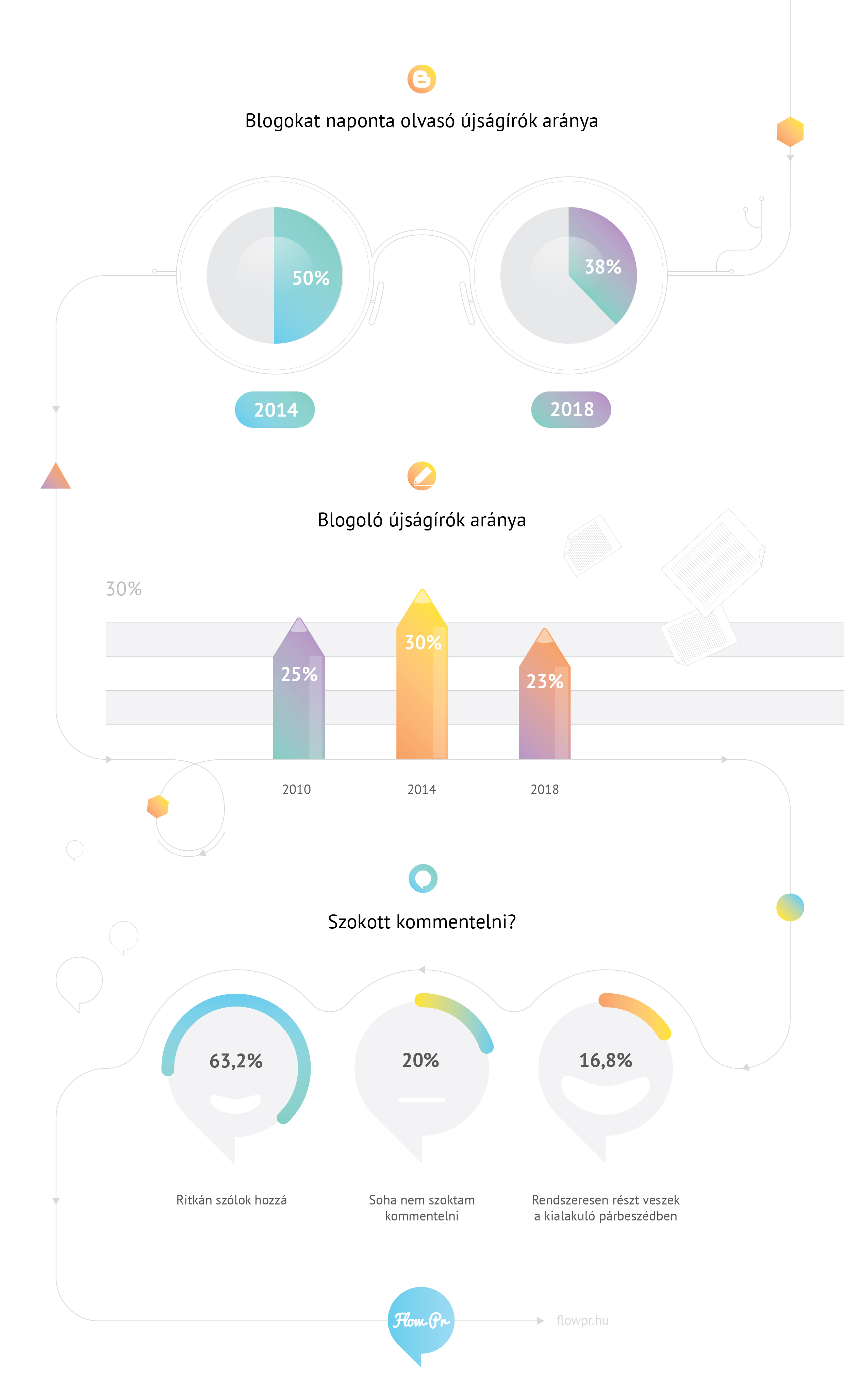 Fordulat állt be a blogok iránti újságírói érdeklődés alakulásában, a 2010 és 2014 közötti jelentős növekedést az elmúlt négy évben visszaesés követte. Feléről harmadára csökkent a blogokat naponta olvasók aránya, a válaszadók ötöde pedig már egyáltalán nem olvas ilyen tartalmakat. Míg 2014-ben az újságírók harmada írt egy vagy akár több blogot, mostanra ez alig 23%-ukról mondható el, ami a 2010. évi szintet is alulmúlja. Nincs változás ugyanakkor a kommentelés terén: a megkérdezettek négyötöde továbbra is csak ritkán vagy egyáltalán nem ír hozzászólásokat a blogposztokhoz.