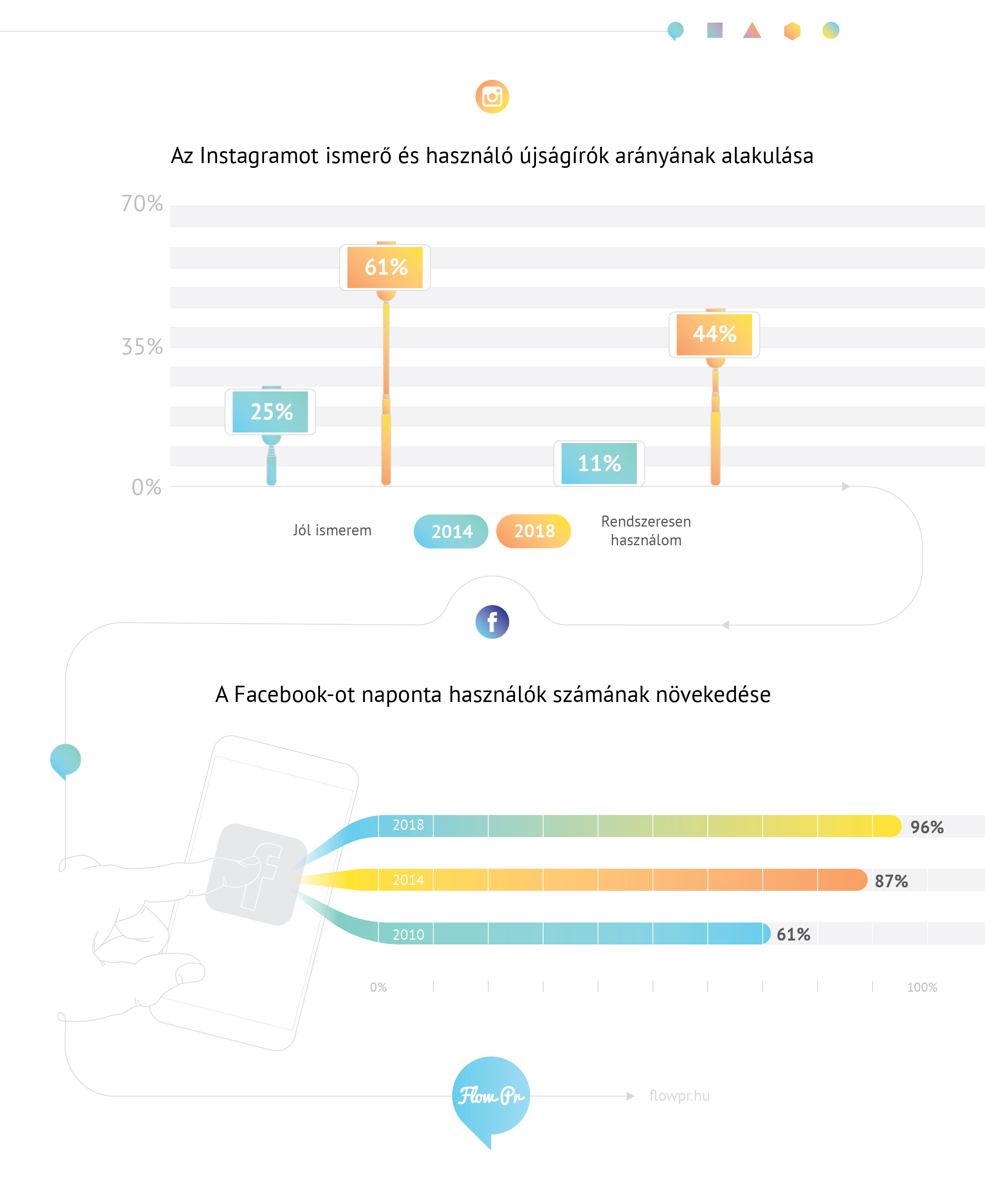 Immár harmadszor vizsgálta az újságírók közösségimédia-használatát a Trendlabor Médiaindex felmérést készítő FLOW PR. A négyévente elvégzett kutatások egyaránt vizsgálják az egyes csatornák ismertségét, használatuk rendszerességét, illetve a közösségi média megítélésének alakulását. Az eredmények összehasonlításából kiderül, hogy míg 2014-ig a Facebook munkacélú használata terjedt a leggyorsabban a sajtó munkatársai körében, addig az elmúlt négy évet már az Instagram térhódítása jellemezte.