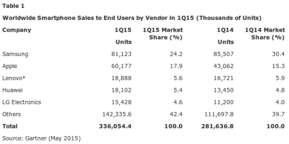 A tavalyi utolsó negyedévben az Apple nagyot robbantott, hiszen az okostelefon eladási adatok alapján ő került az élre, tehát megelőzte a legnagyobb rivális Samsungot. Most kijöttek a 2015 első negyedéves eredmények a Gartner piackutató cégtől és a számok azt mutatják, hogy a koreai óriás alaposan visszavágott. A több mint 81 milliós darabszám jelentősen felülmúlja az Apple 60,1 milliós adatát. Ezzel a Samsung a piac közel egynegyedét uralja, de az Apple számára is majdnem 18% jut, a többiek pedig messze lemaradva követik. Harmadiknak ezúttal is a Lenovo futott be, de épp csak megelőzve a Huawei-t, melyet az LG követ az ötödik helyen. Érdekes trendeket figyelhetünk meg az előző év azonos időszakának számaival összevetve. A Samsung piaci részesedése közel 6%-ot esett, ahogy a darabszám is kevesebb, mint tavaly ilyenkor.
