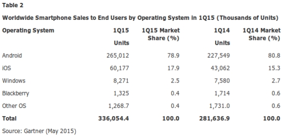Pont ellentétes a folyamat az Apple-nél, ahol mindkét mutató jelentősen nőtt. A Huawei és az LG se nagyon panaszkodhat, náluk is növeknő tendencia van éppen. Ahogy egyébként az egész piacot is ez jellemzi, hiszen míg tavaly 281 millió okostelefon került eladásra az első negyedév során, addig idén már 336 milliónál tartunk. Ha ez a növekedés kitart év végéig, akkor megint 1 milliárd feletti összdarabszám jöhet ki. Nem kevésbé beszédes a mobil operációs rendszerek arányát mutató táblázat. Ahogy az már jó ideje így van, az Android messze vezet, a kevéske csökkenést pedig az Apple iOS fel is vette, azonban így sincs még a közelében sem. Még rosszabb helyzetben vannak a többiek, a Windows abszolút stagnál, a BlackBerry pedig szinte csak dísznek van, akárcsak az összes egyéb (pl. Firefox, Ubuntu stb.) operációs rendszer.