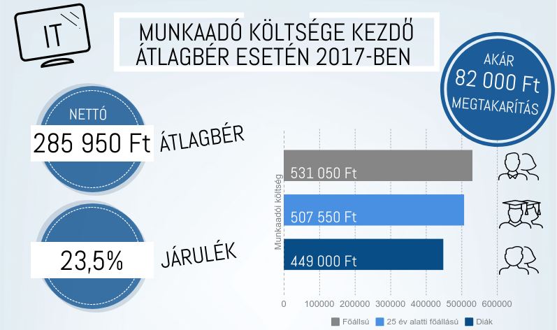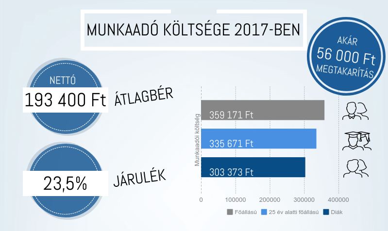 2017-ben 193.400 forint volt a nettó átlagfizetés, amely 359.171 forint összköltséget jelentett a munkaadónak egy főállású alkalmazottra vetítve. Ha ugyanez az alkalmazott 25 év alatti, akkor 335.671 forinttal kalkulálhatott a kifizető, ha pedig diák, akkor 303.373 forinttal, azaz az alkalmazás típusa havonta személyenként 24-56 ezer forint többletet vagy éppen megtakarítást jelenthetett.