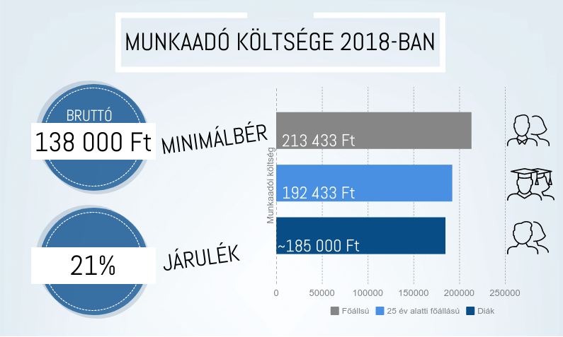 2018-ban 138.000 Ft lesz a bruttó minimálbér. Ez az összeg egy diák munkaerőnek nettó 117.300 Ft-ot, az őt foglalkoztató cégnek pedig nagyságrendileg 180-190.000 Ft-os összköltséget jelent (a piacon szereplő iskolaszövetkezetektől kapott ajánlatoktól függően). Ha ugyanezt a pénzt szeretné hazavinni egy főállású munkaerő, a munkaadónak ez már 213.433 forintjába kerül, 25 év alatti munkavállaló esetén pedig 192.433 forintjába.