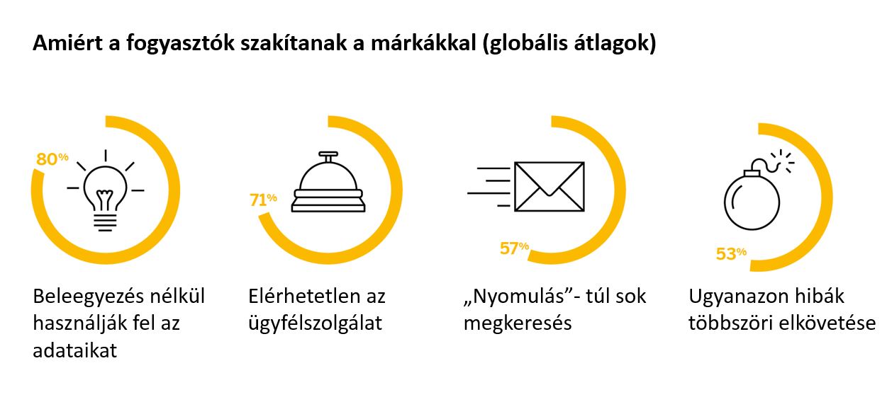 A kapcsolatot megőrzéséhez ugyanakkor az is kell, hogy nagy hibák ne legyenek. A megkérdezettek 80 százaléka jelezte azt, hogy elpártolna az adott brandtől, ha tudta nélkül használnák fel személyes adatait, míg 71 százalékuknál az verné ki a biztosítékot, ha nem válaszolna időben az ügyfélszolgálat. De a szükségtelen reklámüzenetek, hosszas ügyintézési idők, az ugyanazon hiba többszöri elkövetése is „válóoknak” számít.