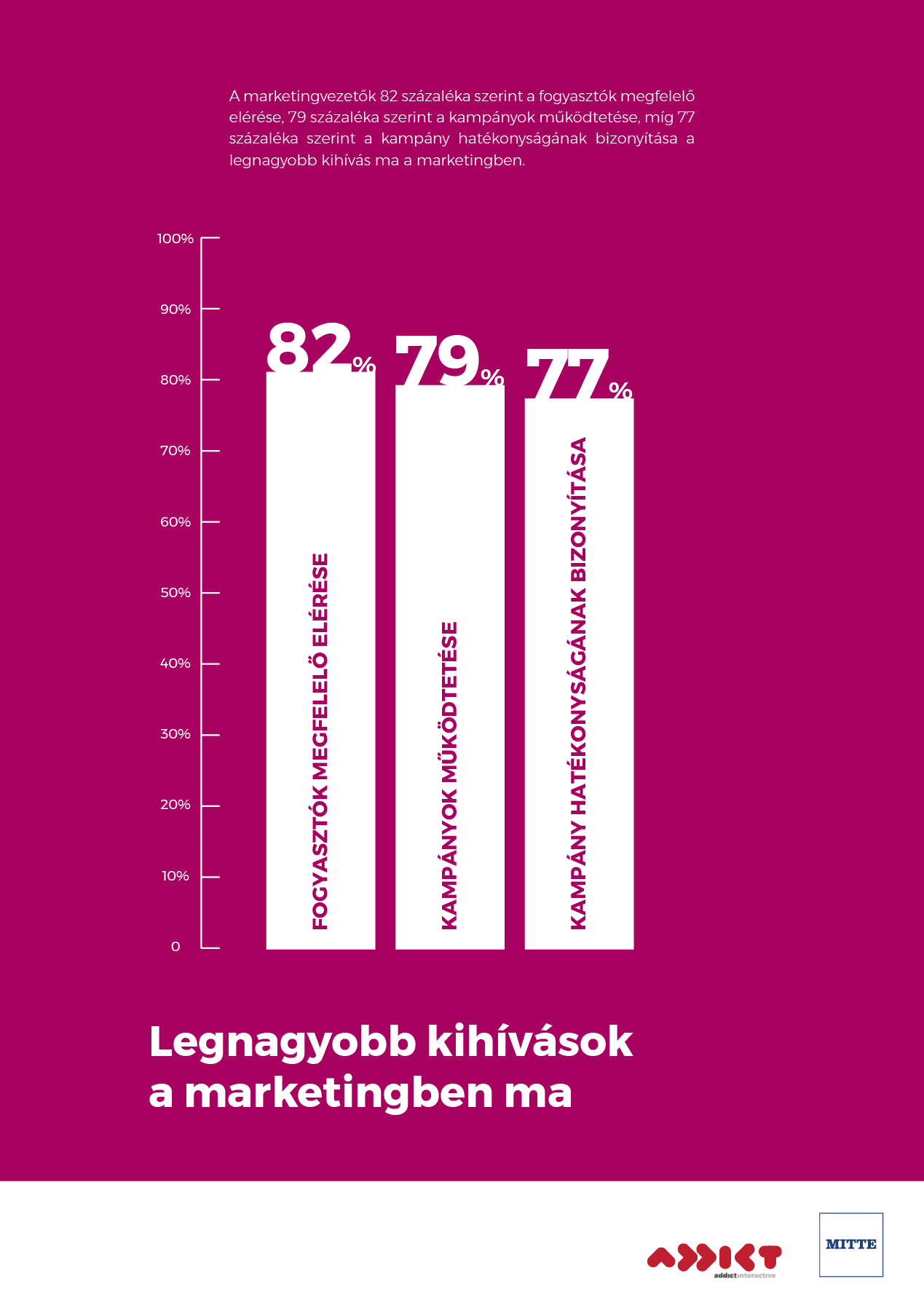 A marketingvezetők 82 százaléka szerint a fogyasztók megfelelő elérése, 79 százaléka szerint a kampányok működtetése, míg 77 százaléka szerint a kampány hatékonyságának bizonyítása a legnagyobb kihívás ma a marketingben.