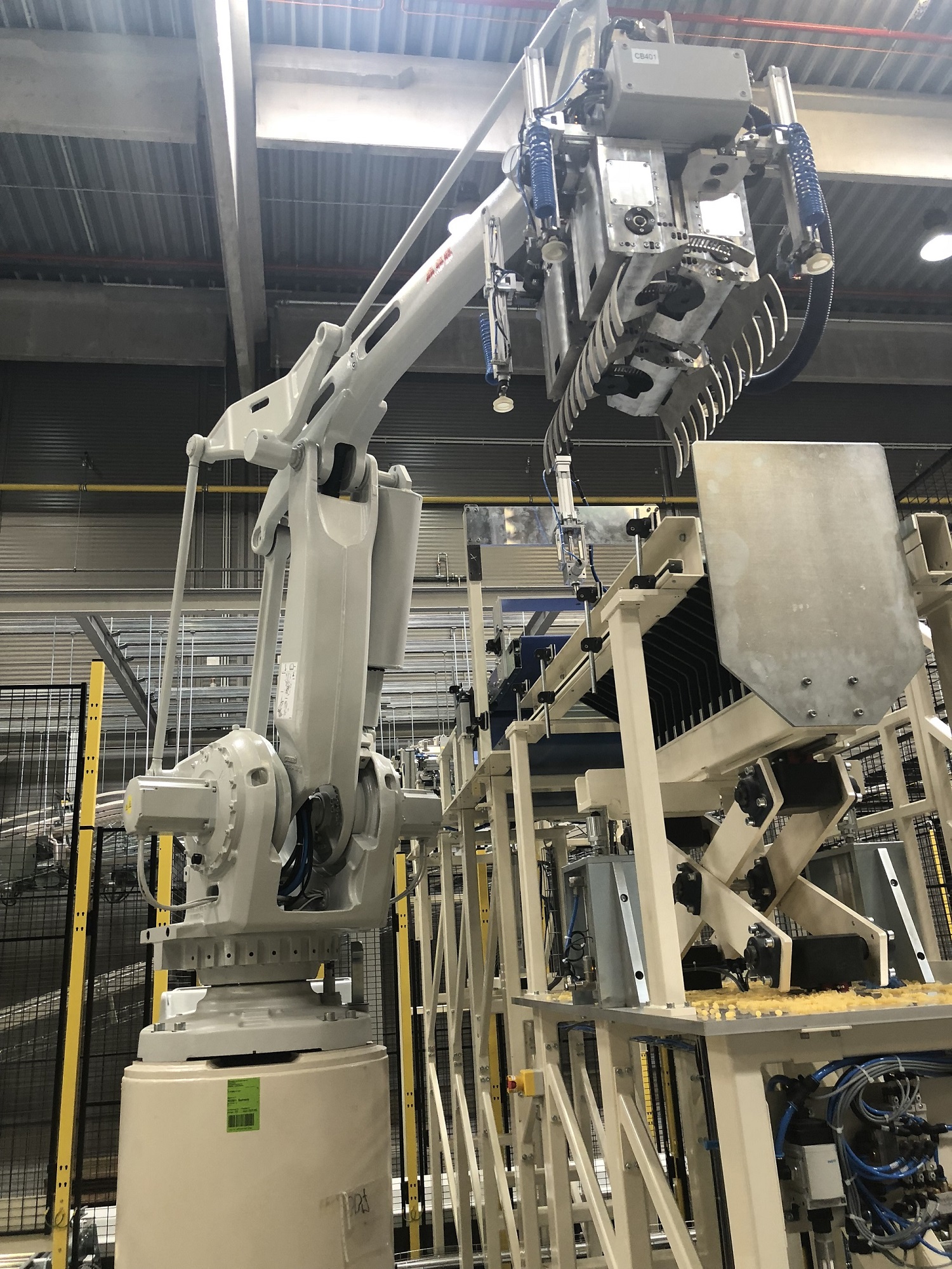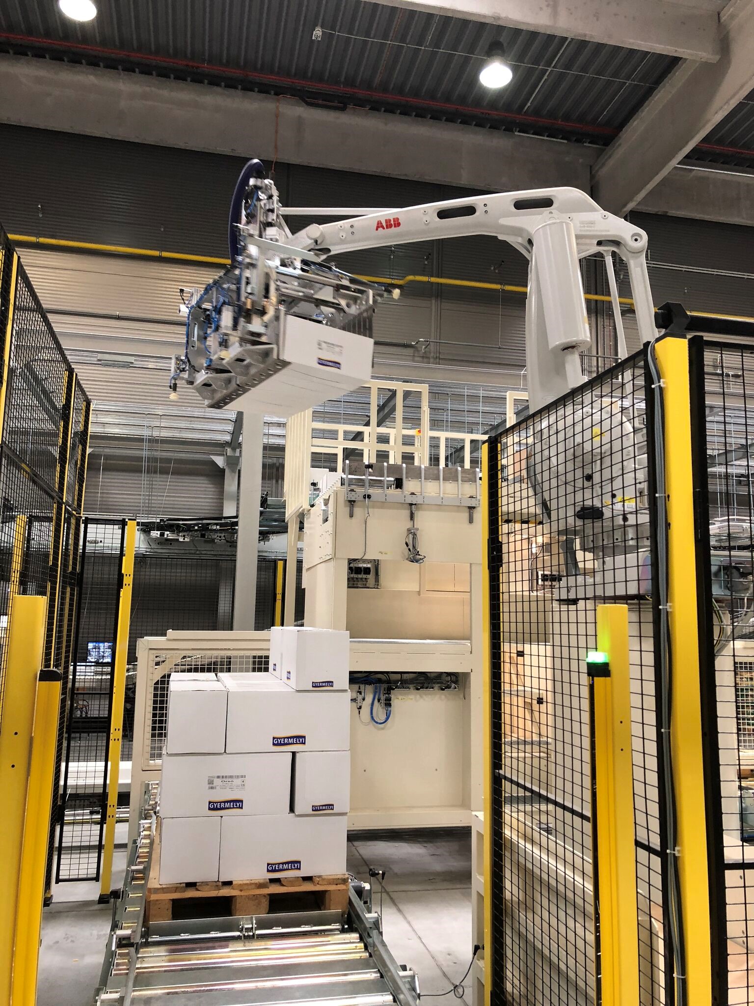 A robotos palettázó rendszer összesen öt robotból áll, melyből kettő kartonos termék palettázására alkalmas robot, kettő zsákos termék palettázására alkalmas és egy robot szolgálja ki raklappal a palettázó robotokat.