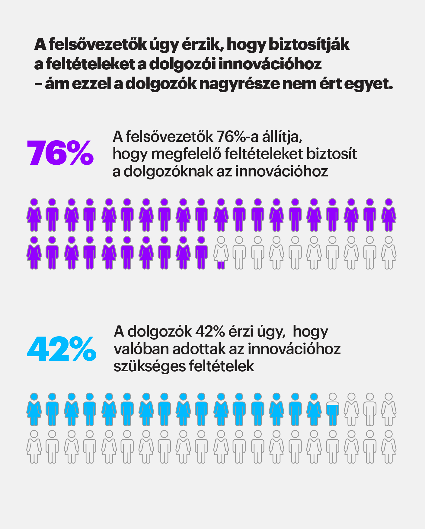 Előfordulhat, hogy bizonyos innovációra motiváló tényezőket eltérően látnak a vezetők és a dolgozók – ezt a vállalatoknak fel kell ismerniük és meg kell szüntetni. Amíg globális szinten a felsővezetők 76%-a gondolja úgy, hogy minden feltételt biztosít a dolgozói innovációhoz, ezt csak a dolgozók 42%-a látja így. Például, a vezetők túlbecsülik a pénzügyi juttatás – mint motiváló tényező – jelentőségét, ugyanakkor az egyértelmű célmeghatározást ebből a szempontból kevésbé tartják fontosnak. Az egyenlőség kultúrájában az innovatív gondolkodásmódot támogató legfontosabb tényezők a releváns készségekre összpontosító oktatás, a rugalmas munkaszervezés és a munka-magánélet egyensúlyának tiszteletben tartása.