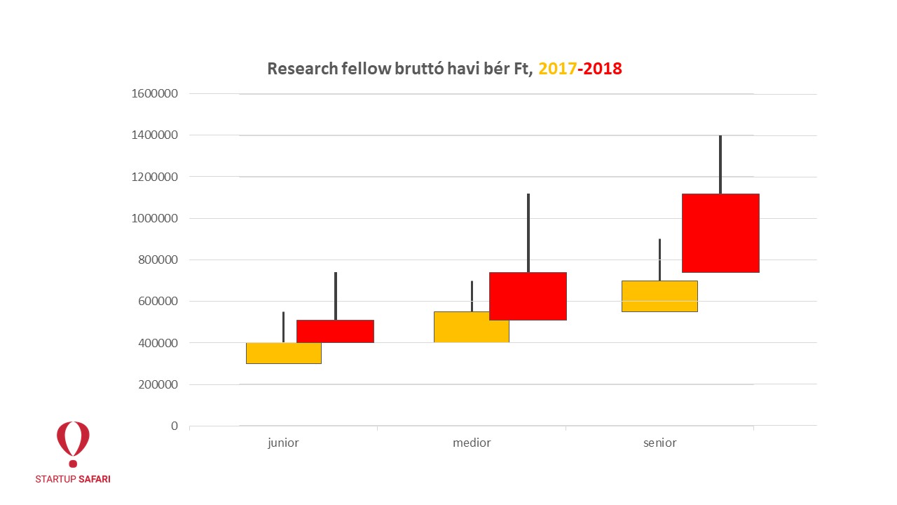 A csupán 1-2 éves tapasztalattal rendelkező junior kutatói pozíciók bérsávja a bruttó 300-400ezres sávból egy év leforgása alatt 400-510ezres sávba emelkedett, ami 25-30 százalékos növekedésnek felel meg. 3-4 éves tapasztalattal 2017-ben 400-550ezer között lehetett keresni, ma már 510-740ezer közé esnek ezek az ajánlatok. A szeniorok körében is hasonló léptékkel nőttek a bruttó havi bérek: az 550-700ezres sávból 2018-ra 740ezertől 1,1millióg terjedő intervallumig. Míg a legkiugróbb értéknek 2017-ben egy 900ezres bruttó ajánlat minősült, 2018-ban az IseeQ felmérésében érintettek közt felbukkant 1,4millió forintos havi bér is.