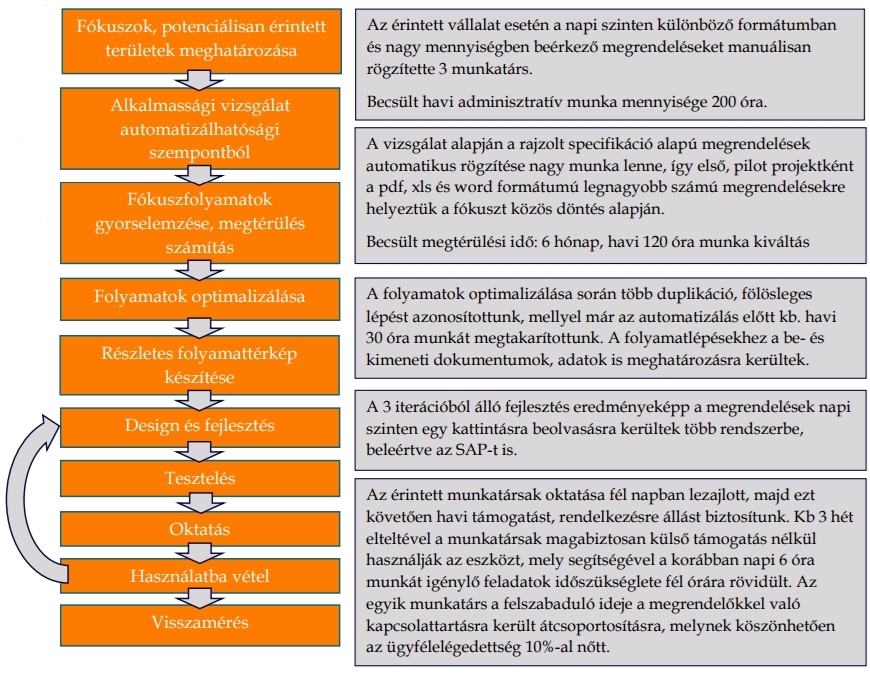 Az alábbi ábrán a Proman Consulting egyik, nagykereskedelemmel foglalkozó ügyfelénél végzett RPA-implementálását feldolgozó esettanulmányának összefoglalója látható. Annak érdekében, hogy a fölösleges munkát és az értékes, megrendelő oldali erőforrás-felhasználást elkerüljék, a robotizáció során egy iteratív megközelítést alkalmaztak.
