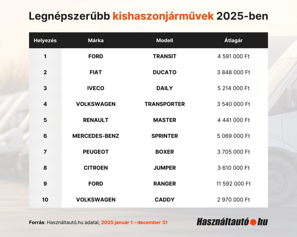 A Használtautó.hu a 2025-ös, valamint a 2026 januári kínálati adatok alapján vizsgálta a hazai kishaszonjármű-piac alakulását. Az adatok szerint a Ford Transit továbbra is magabiztosan vezeti a legnépszerűbb modellek listáját, a Fiat Ducato őrzi második helyét, ugyanakkor a dobogó harmadik fokán változás történt: a Volkswagen Transporter megelőzte az Iveco Daily-t. A pickupok eközben továbbra is jóval magasabb árszinttel és fiatalabb átlagéletkorral szerepelnek a hirdetésekben a klasszikus kishaszonjárművekhez viszonyítva.