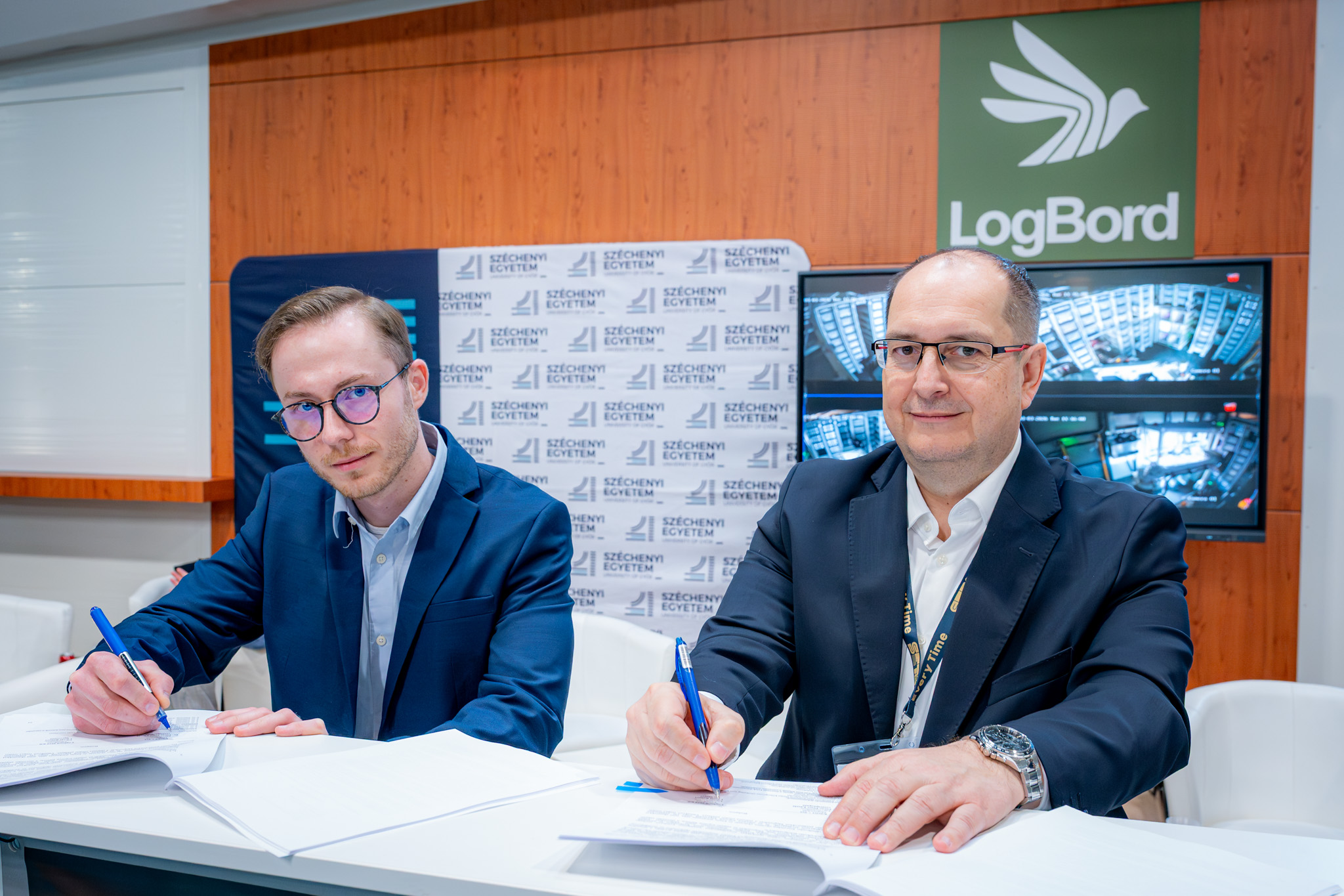 Dr. Pőcze Péter László, az egyetem tulajdonában lévő Közért+ Zrt. vezérigazgatója és László Róbert, a LogBord Kft. ügyvezetője a SIRHA 2026 Budapest nemzetközi szakkiállításon írta alá az automata bolttal kapcsolatos megállapodást. (Fotó: Adorján András/Széchenyi István Egyetem)