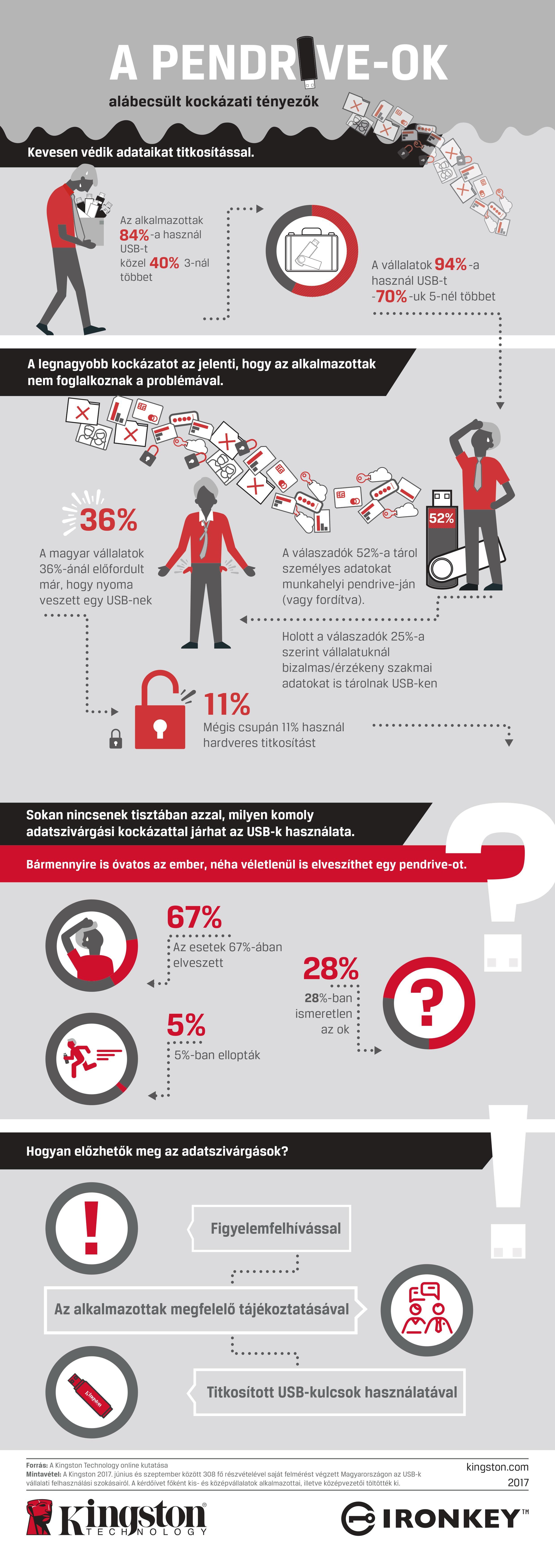 A Kingston Digital Europe Co LLP bemutatta a Magyarországon és az EMEA-régióban végzett kutatásának eredményeit, melyek arra mutattak rá, hogy a vállalatoknál még mindig alulértékelt kockázati tényezőknek számítanak az USB-k adatkezelési szempontból. A felmérés szerint a szervezetek mintegy kétharmada nem alkalmaz megfelelő biztonsági intézkedéseket annak érdekében, hogy biztonságosan tárolják az adatokat a pendrive-okon.