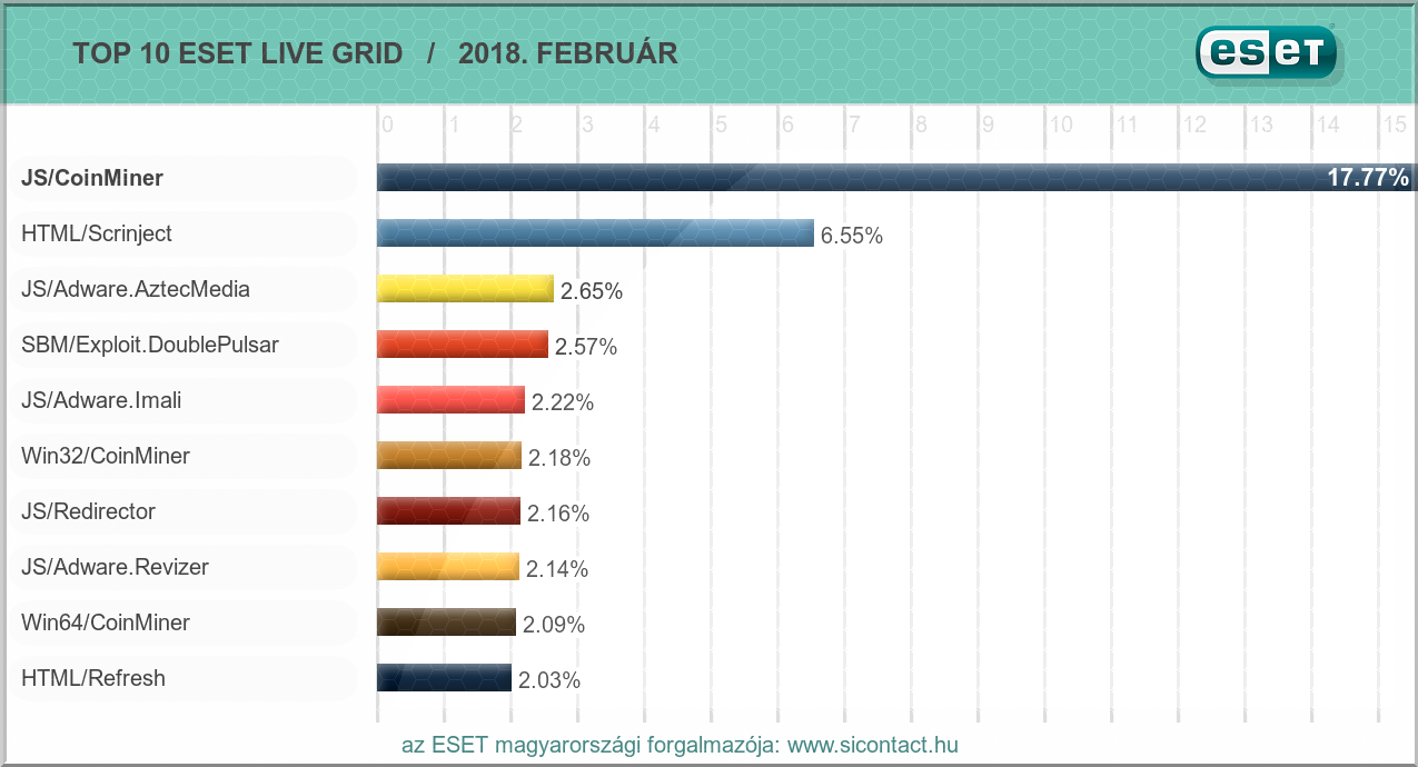 A Top10 listát változatlanul hatalmas fölénnyel a JS/CoinMiner trójai vezeti. A JS/CoinMiner olyan szkript, amely a felhasználó tudta nélkül képes a kriptográfiai valuták bányászatára. A kártevő segítségével észrevétlenül Feathercoin, Litecoin vagy Monero bányászatra használják az áldozat számítógépének erőforrásait, és az érintett felhasználók nagy száma miatt a támadók ezzel jelentős bevételekre tehetnek szert. A weboldalak megfertőzésével ugyanis egyszerűbben lehet sok felhasználót elérni, mint az áldozatok gépeit egyenként megfertőzni.