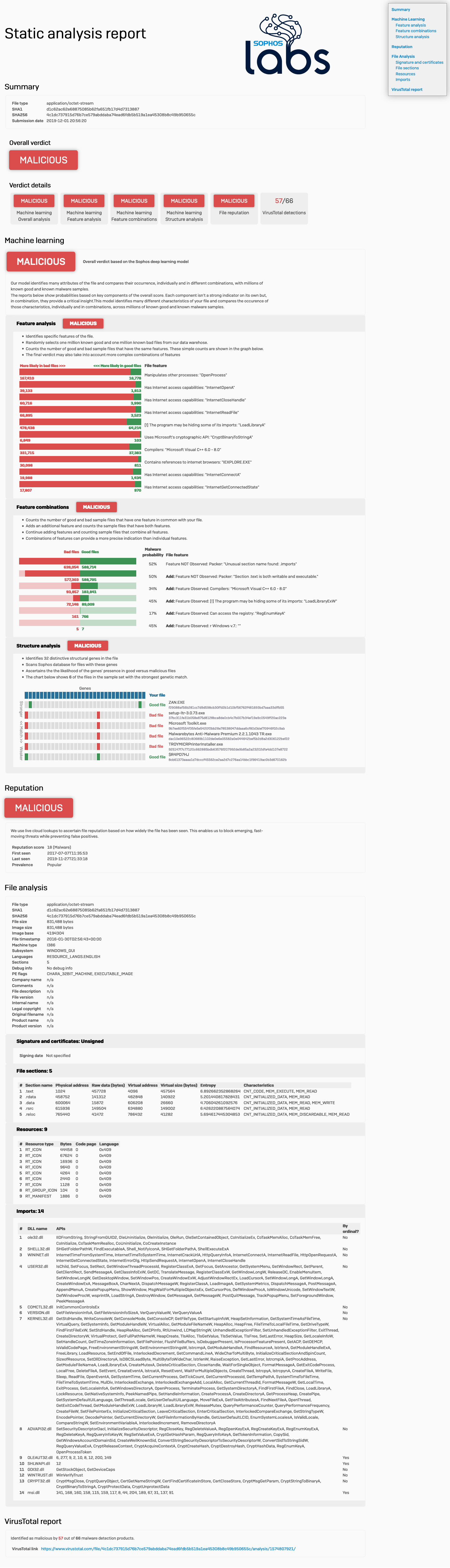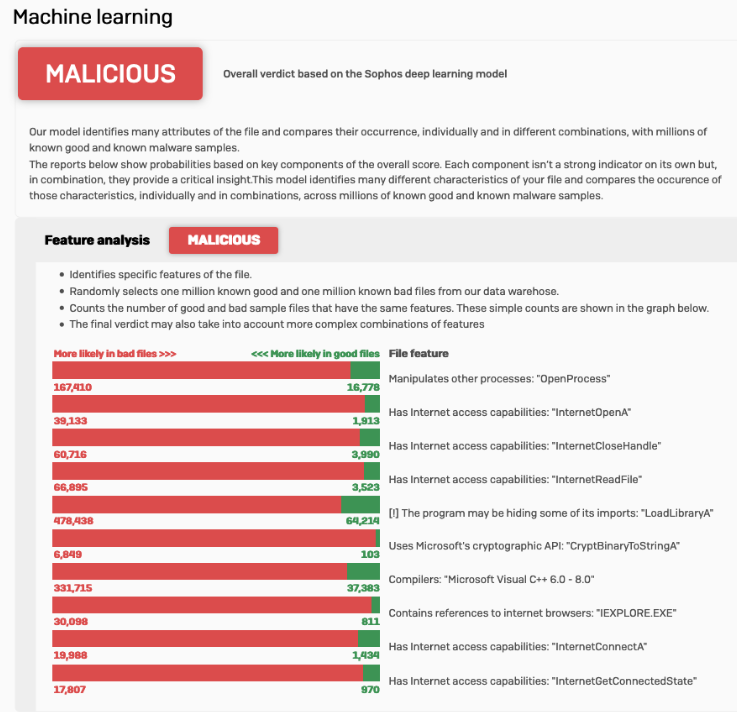 - Statikus fájl analízis: Több machine learning modell használatával, a “reputáció” vizsgálatával, mély fájl elemzéssel és más módszerek alkalmazásával elemzi a fájlt úgy, hogy azt nem kell valósidőben futtatnia.