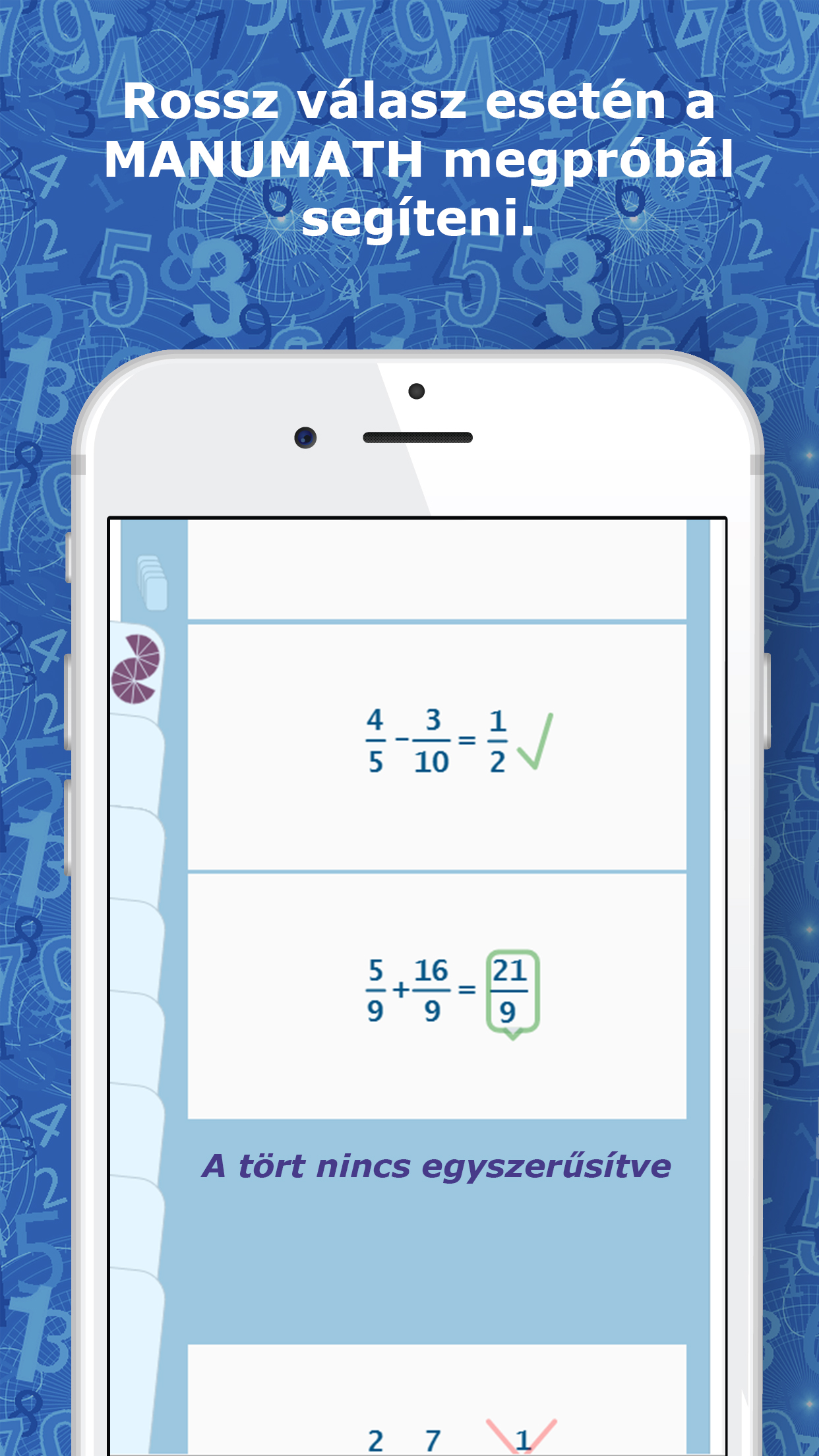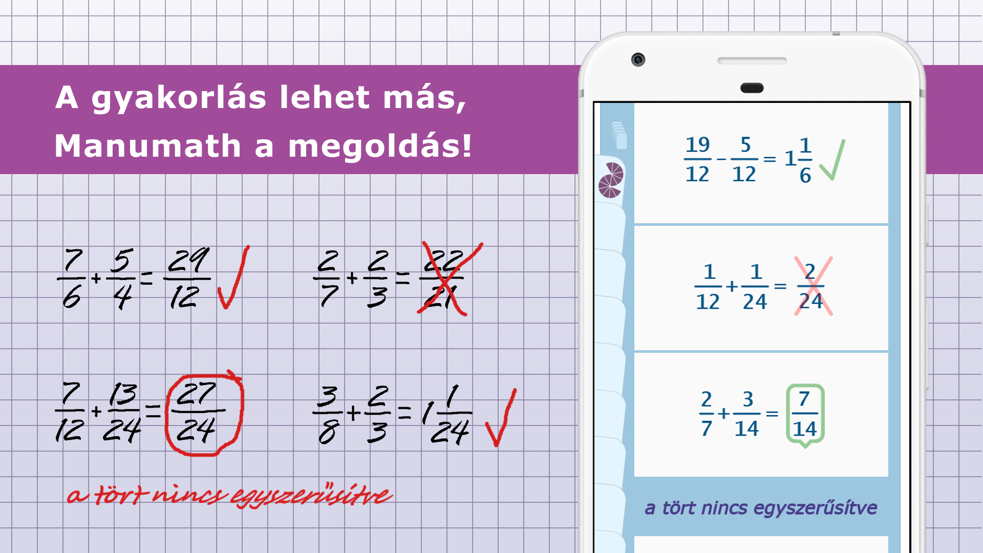 Ugyanakkor a sokszor oda nem illő, figyelemelterelő színes ábrákat sem tartják szerencsésnek gyakorlás közben, mert a gyermekeknek legtöbbször ezek nélkül sem egyszerű az odafigyelést megtanulniuk, teszik hozzá az app alkotói. A Manumath még abban is különbözik a többi elérhető alkalmazástól, hogy itt szabad formában is megadható a végeredmény. Ha egy feladat megoldása másfél, akkor a háromkettedet és az egy egész egykettedet is elfogadja helyes válasznak.