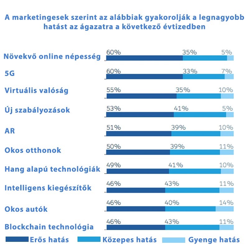 Az előttünk álló évtizedet a marketingesek a technológiai és társadalmi változások korszakának vizionálják. A jóslataik szerint a vezeték nélküli 5G hálózatok leszenek a legnagyobb befolyással a munkájukra, miközben a legtöbb új lehetőséget és vásárlót online kívánják megtalálni, merthogy a digitalizáció minden eddiginél jobban hatja majd át a társadalmat a 2020-as években.
