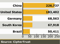 A világ 5 legnagyobb „zombi szülőhelye”, vagyis az az öt ország, ahol a legtöbb fertőzött számítógép található, adja az „öntudatlanná vált” PC-k több mint felét. Kína jár az élen több mint 200 ezer botnetben részt vevő komputerrel, második az USA 180 ezer körüli értékkel, míg Németország a harmadik, Dél-Korea a negyedik és Brazília az ötödik.