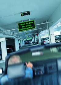 Klikk a képre!Az 1-es terminál parkolóházainak minden parkpozíciója fölé egy ultrahangos érzékelőt szerelnek, amely biztonsággal felismeri, hogy az szabad vagy foglalt-e. A foglaltsági információt a parkolótér-menedzsment rendszer veszi át, így központilag mindig teljes és aktuális az áttekintés. Ez mind a parkoló-felügyelet, mind az autósok dolgát megkönnyíti. Utóbbiaknak nem kell többé üres helyet keresgélniük: a rendszer a legrövidebb úton elvezeti őket a legközelebbi szabad helyre. Erre szolgál a parkolókban telepített összesen kétszáz LED-jelzőtábla, melyek egy Simatic S7 vezérlésen át kapcsolódnak a központi menedzsment-rendszerhez. Ezáltal el lehet kerülni, hogy egyszerre több autóst irányítsanak ugyanarra a parkhelyre illetve túl sok autóst egy olyan szektorba, ahol esetleg csak néhány üres hely van már.