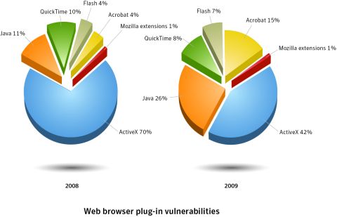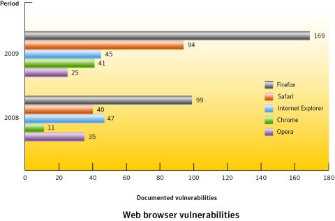 Böngésző-sebezhetőségekA böngészőn alapuló alkalmazások sérülékenységei szaporodnak a leggyorsabban. A Mozilla Firefox esetében minden más böngészőnél több, 169 új sérülékenységre leltek 2009-ben. Egyes böngészőknél sokkal tovább tart, amíg védetté teszik őket az új veszélyek ellen. Az Apple Safarinál ez átlagosan 13 napot vesz igénybe, az Internet Explorer, a Mozilla Firefox és az Opera esetén a leggyorsabb a javítás, itt ugyanis átlagosan egy napnál kevesebb idő szükséges a védettség kialakításához.