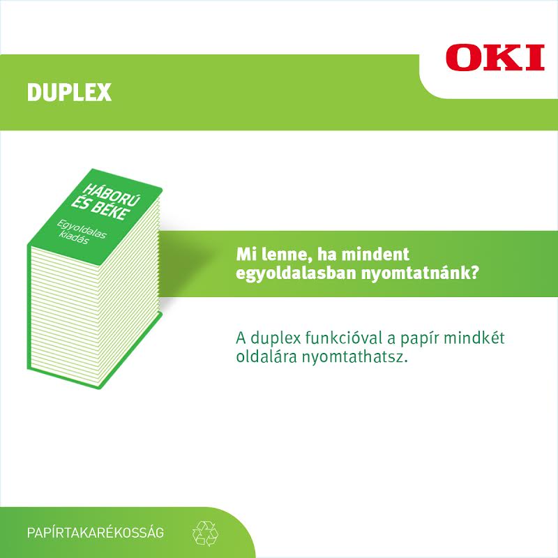 A leggyakrabban használt költségcsökkentési megoldás a kétoldalas nyomtatás, amit az OKI multifunkciós készülékein a Duplex nyomtatás menüpont alatt találunk. A legokosabb megoldás, ha eleve ezt adjuk meg alapértelmezett beállításként, és csak akkor váltunk egyoldalas nyomtatásra, ha kifejezetten arra van szükség.