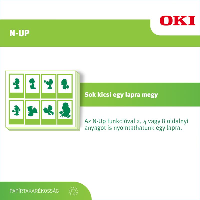 Azzal is csökkenthetjük a papírigényt, ha kisebb méretben nyomtatunk vagy fénymásolunk, hiszen sok esetben csökkentett méret mellett is megfelelően látható a tartalom. Ha egy többoldalas dokumentumot szeretnénk takarékosan kinyomtatni, egy oldalra tömörítve mondjuk egy prezentáció diáit vagy egy konferencia programját, akkor az N-Up funkciót használva 2, 4 vagy akár 8 oldalt is rányomtathatunk egy oldalra. Ez a funkció ugyanakkor arra is alkalmas, hogy egy dokumentum egymással megegyező tartalmú oldalait kisebb méretben sokszorosítsa, így például egy menükártyát egy oldalra helyezve több példányban nyomtat ki, a nyomatot pedig kiosztás előtt már csak darabokra kell vágni.