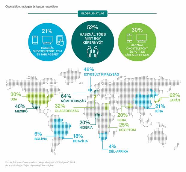 Az Ericsson ConsumerLab által készített jelentésből kiderül, hogy a fogyasztók mobil eszközhasználata során a munka és a magánélet közötti határok éppúgy elmosódnak, ahogyan az otthoni és a szabadtéri tartózkodás között. A felhasználók helytől és időponttól függetlenül egyre inkább váltogatják a képernyőket (eszközöket), hogy a legváltozatosabb helyszínekről is hozzáférhessenek különböző szolgáltatásokhoz és tartalmakhoz.