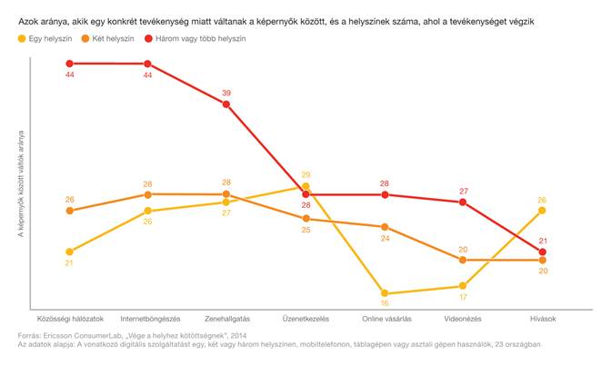 Egy további fontos megfigyelés szerint ahogyan növekszik azoknak a helyeknek a száma, ahonnan az emberek feladatokat látnak el, úgy nő az általuk használt képernyők száma is. Például a közösségi hálót egy helyszínen használó fogyasztók 21 %-a váltogatja a képernyőt, míg ez a szám 44 %-ra emelkedik azoknál, akik a közösségi hálót legalább három helyszínen használják.