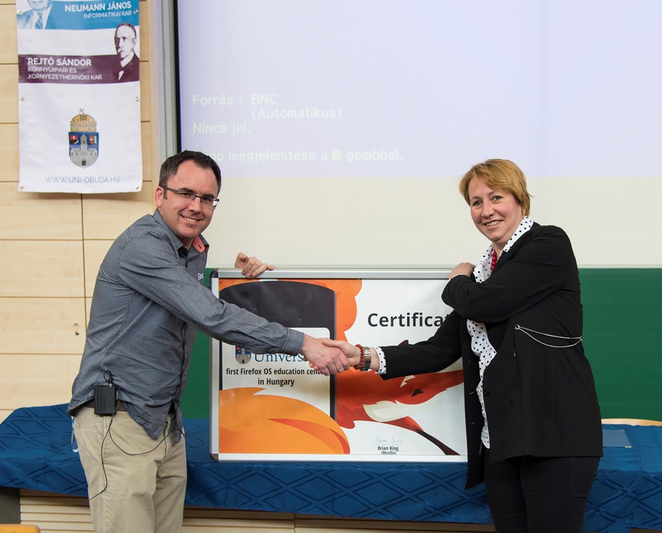 Brian King, a Mozilla európai közösségi menedzsere tanúsítványt adott át Dr. Ősz Ritának, az Óbudai Egyetem nemzetközi és közkapcsolati rektorhelyettesének, amellyel az intézmény jogosult a világon elsőként Firefox OS oktatási centrumként üzemelni.