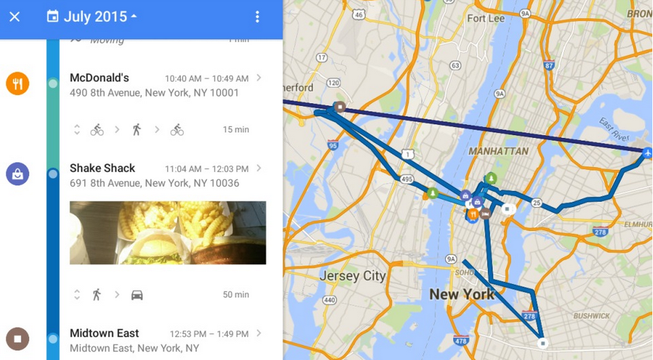 A minap azonban a Google Maps egy olyan funkcióval egészült ki, mely megdöbbentően sokat tud arról, merre is járunk a nap folyamán. A Your Timeline az alkalmazásban balra lapozva, a Your Places menüpont alatt jelenik meg, és lista szerűen kiírja, hogy merre látott minket a keresőóriás, sőt még képeket is kipakol, ha a Google Photos appot használjuk képeink rendszerezésére. Sajnos mi még nem tudtuk telepíteni az alkalmazás frissítését, de hamarosan minden Android és webes felhasználónak elérhető lesz az újdonság, addig is köszönjük a lenti képet a The Verge-nek és az Engadgetnek.