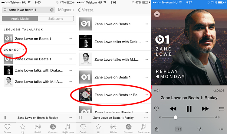 Ha nem akarunk külföldi fiókkal vagy proxy szerverekkel bajlódni, a képen látható módon a Connect kategóriára kattintva itthonról is hallgathatjuk néhány nagyobb előadó műsorát. Keressünk rá például a “Zane Lowe Beats 1” vagy a “Julie Adenuga Beats 1” -ra, és ott találjuk a Connect kategóriát a találatok között.
