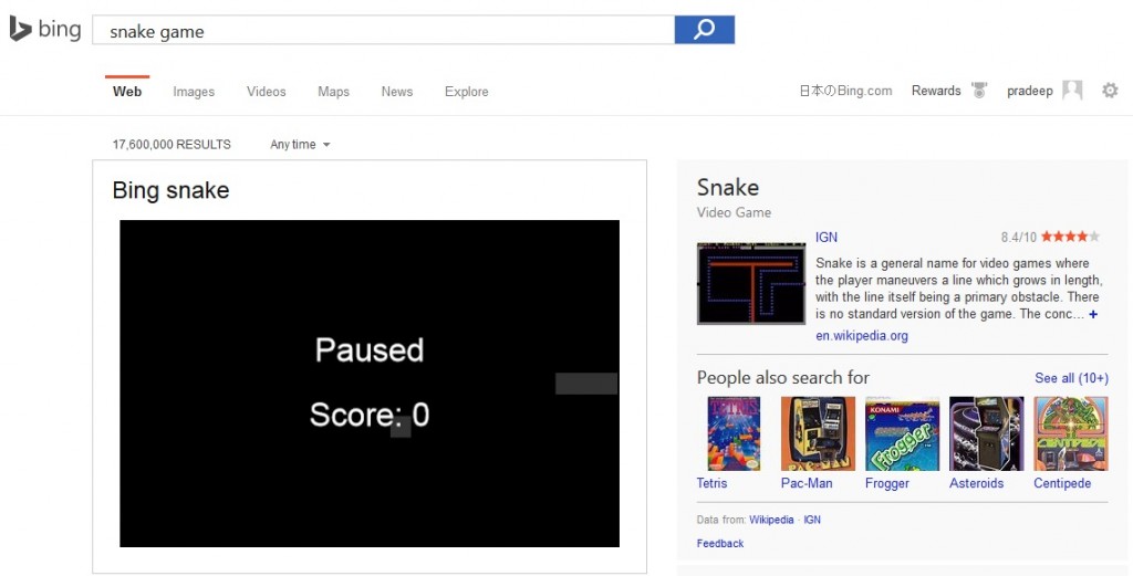 Úgy látszik, hogy ez a Microsoftnak is megtetszett, hiszen egy izgalmas funkcióval bővítette a Bing kereső repertoárját. David Flink felfedezése alapján, ha valaki azt írja be a Bing-be, hogy Snake game, akkor a keresőmotor legelső találatként egy videónak kinéző, valójában teljesen játszható játékot ad ki.
