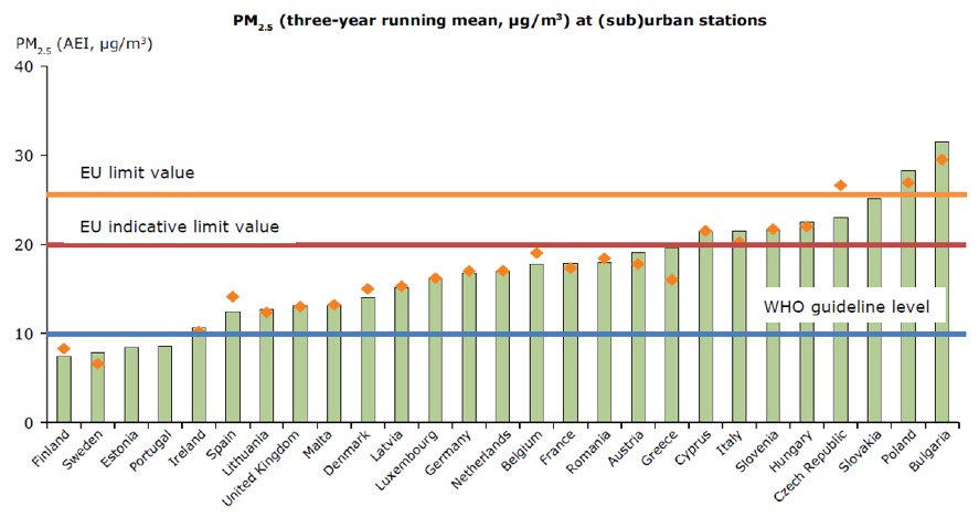 A következő oldalon található diagram tökéletesen szemlélteti Magyarország helyzetét a levegőszennyezettséggel kapcsolatban. Az ábra a 2,5 mikronnál kisebb szálló por koncentrációjának mért éves átlagértékeit és az átlagos expozíció indexet (AEI = narancs pont) jelöli a tagállamok városi mérő állomásain. A WHO egészségügyi ajánlásának megfelelő karcinogén por átlagkoncentrációt mindössze 5 tagállamban mértek a 2009-2011 közötti három évben. (Forrás: EEA)