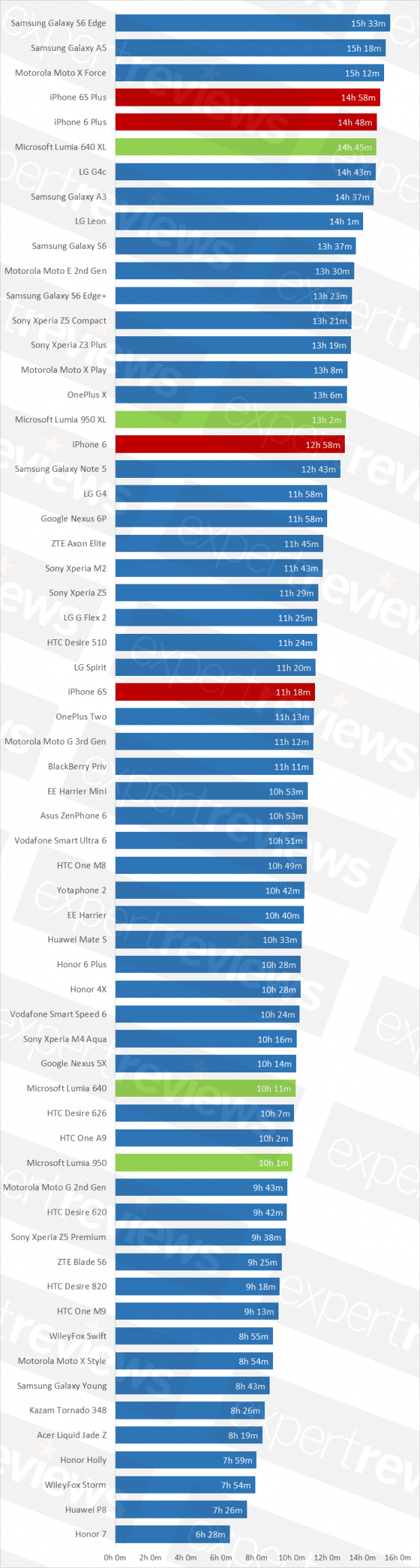 Az eredmények annak fényében meglepőek, hogy az első helyezett két és félszer annyi ideig bírta, mint az utolsó, azaz igen is van különbség a mai modellek tekintetében is. A győztes a Samsung Galaxy S6 Edge, míg a második helyre a dél-koreai gyártó másik modellje, a Galaxy A5 futott be. A harmadik a nálunk nem forgalmazott Motorola Moto X Force lett, míg az iPhone 6S Plus és 6 Plus végzett a negyedik és ötödik helyen. A Microsoft modelljei közül az új, Lumia 950-es győzedelmeskedett, az XL variáns 13 órán át működött.