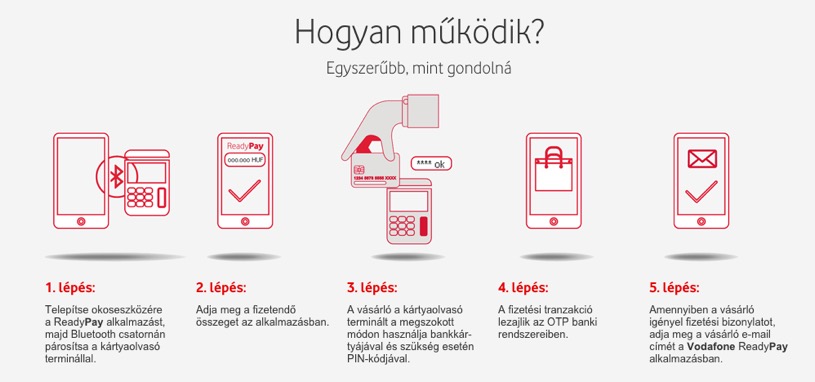 A ReadyPay mPOS terminál a vele bluetooth kapcsolattal párosított okostelefon, vagy táblagép segítségével kapcsolódik az internetre. A fizetési tranzakció az okoseszközre telepített Vodafone ReadyPay alkalmazás segítségével kezdeményezhető a fizetendő összeg megadásával. Ezt követően a kártyabirtokos az mPOS terminál segítségével leolvashatja bankkártyáját vagy mobiltárcáját, illetve szükség esetén beütheti PIN kódját. A fizetési tranzakció ezután a hagyományos bankkártya leolvasóknál megszokott módon zajlik le az OTP banki rendszereiben, amelynek eredményéről az okoseszközre telepített Vodafone ReadyPay alkalmazásra és emailben is értesítés érkezik az elfogadóhoz. A bankkártya birtokosa megadhatja érvényes email címét, így a fizetési folyamat befejezésekor a tranzakció eredményéről visszaigazolást is kaphat.