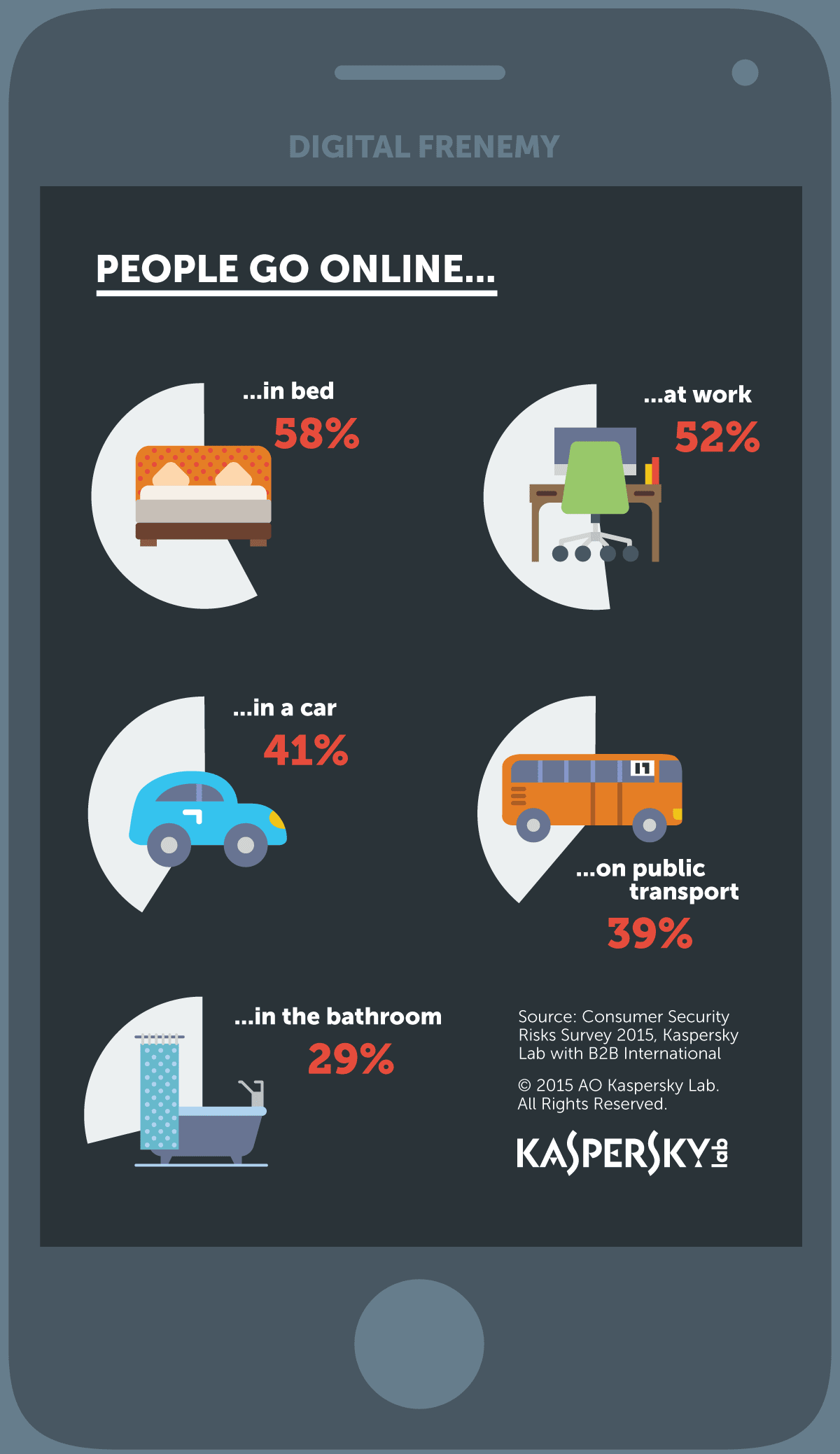 A Kaspersky Lab és a B2B International felmérése szerint a felhasználók és a digitális eszközeik közötti kapcsolat gyakran szorosabb, mint a legjobb barátok közötti viszony, amit az a két tény is alátámaszt, hogy 29%-uk magával viszi őket a fürdőszobába is, illetve 25%-uk olyan titkokat is megoszt eszközeivel, amelyeket senkinek sem mondana el.