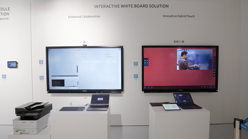 - Interaktív táblák (IWB) – A Samsung multimédia-barát kijelzői lehetővé teszik a valós idejű tartalommegosztást, és bővítik az interaktív kommunikációs lehetőségeket az előadó- és osztálytermekben. Ezek az interaktív táblák tollal és érintéssel is kezelhetők, ami még nagyobb rugalmasságot biztosít.