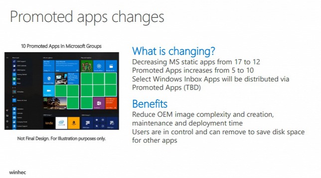 A prezentációból kiderült, hogy az eddigi 5 darab reklám helyett 10 kerülne a Start menübe, amelyekre kattintva egyből az adott applikáció letöltőoldalára juthat a felhasználó. Természetesen ezek országonként eltérőek lesznek, így mindenhol előtérbe kerülhetnek a hazai fejlesztők. Az ajánlókat azért ki lehet majd kapcsolni, de valószínűleg ezt sokan nem teszik majd meg, lévén a Microsoft aligha helyezi majd előtérbe ezt az opciót. A kényelmetlenséget tartalmazó frissítés nyáron, a Windows 10 egy éves szülinapján jelenik meg.