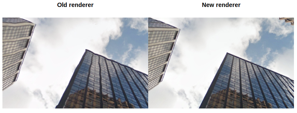 További újdonság, hogy a Google fejlesztői egy új, 360 fokos algoritmust is készítettek, így innentől kezdve már a domboldalakon lévő épületek is valós képüket mutatják majd, nem torzítja el a vonalaikat a rendszer. Sőt, a távolabbi, magas házak éleiről is eltűnik a hullám, így már ezeket is valósághűen mutatja meg nekünk a Google.