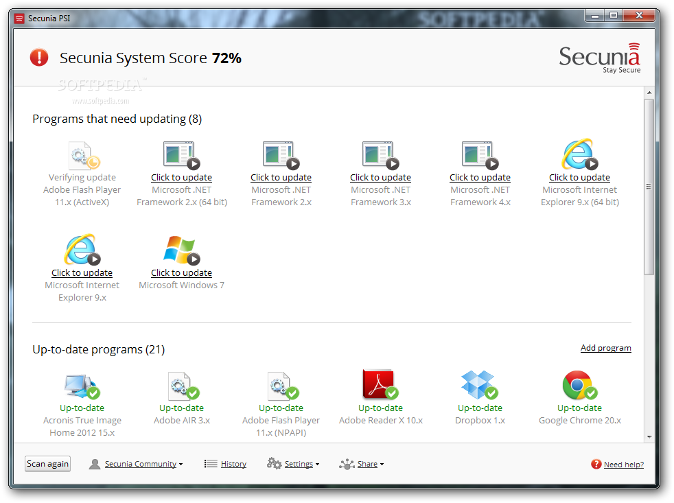 Amennyiben nemcsak 2-3 alkalmazást tartasz a számítógépeden, úgy érdemes feltelepítened a Secunia PSI-t. A szoftver ugyanis nem tesz mást, mint folyamatosan figyeli, hogy az éppen feltelepített szoftvereknek jelent-e meg frissítése. Amennyiben igen, úgy tájékoztatja arról a felhasználót és igény szerint fel is telepíti azokat.