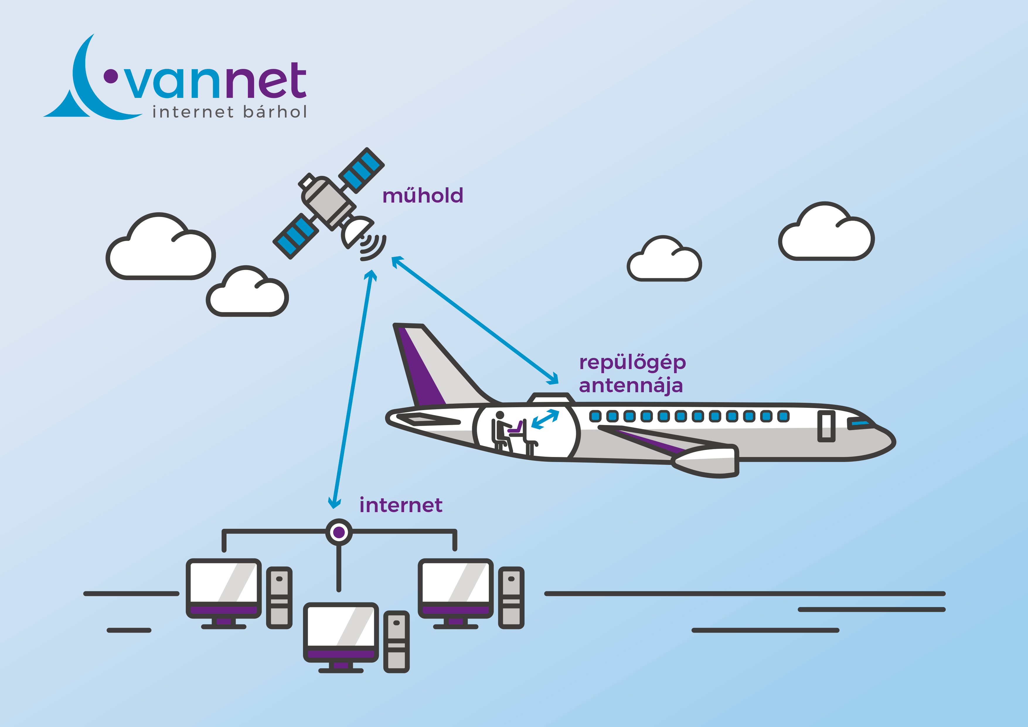 „A repülőgépek fedélzetén a földi mobilinternet- és wifi-hálózatok többnyire nem érhetőek el, mert ezek – érthető okokból – csupán száz-kétszáz méteres magasságig sugároznak. Bár technikailag lehetséges, de ésszerűtlenül drága lenne olyan földi rendszer kiépíteni, amely a tízezer méter körüli utazómagasságokon is folyamatos hozzáférést tud biztosítani. A légitársaságok ezért egy kézenfekvő megoldást választottak, a műholdas internetet”