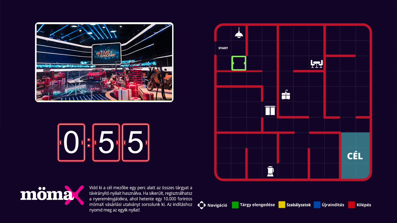 Az interaktív játékban azok vehetnek részt, akik az internetre csatlakoztatott HbbTV-képes tévékészülékkel rendelkeznek, továbbá igénybe veszik az ingyenes földfelszíni MinDig TV szolgáltatást vagy a MinDig TV Extra előfizetői. Akinél a feltételek adottak, a Bezár a bazár műsor ideje alatt a TV2 csatornára kapcsoláskor egy, a játék elérhetőségével kapcsolatos felugró szöveggel vagy képpel találkozik. A távirányító piros gombjának megnyomásával osztott képernyőn jelenik meg az interaktív játékfelület. A játékos a tévékészülék távirányítójának gombjai segítségével játszhat; a játék célja, hogy meghatározott idő alatt „kivigye” a tárgyakat egy virtuális helyiségből. A rendelkezésre álló időt egy visszaszámláló óra mutatja. Ha a játékos az összes tárgyat ki tudta vinni, akkor egy következő képernyőre lép át, melyen a telefonszámának megadásával regisztrálni tud a nyereménysorsolásra. A játékosok között hetente egy 10.000,-Ft értékű Mömax vásárlási utalvány kerül kisorsolásra. A játék részletes szabályzata ITT érhető el.