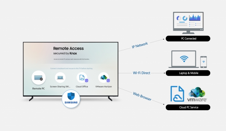 A Samsung DeX alkalmazással a mobilokat egy külső képernyőhöz, így akár a tévéjükhöz is csatlakoztathatják a felhasználók és úgy működtethetik, mint egy asztali számítógépet. Az irodában maradt gépek távoli elérése is lehetséges az RDP alkalmazás és VPN hozzáférés segítségével, így a munkavállalók mindenhez hozzáférnek, amivel a mindennapokban dolgoznak. A DeX emellett lehetőséget biztosít a mobileszközök laptophoz való csatlakoztatására is egyetlen USB kábel segítségével. Ilyenkor a felhasználók könnyedén másolhatnak fájlokat az eszközök között és azokat a számítógép kezelőfelületén módosíthatják. Az eszközök biztonságát a Samsung a Knox védelmi rendszerrel garantálja, amely az okostelefont teljeskörű szoftveres és hardveres védelemmel látja el, így az szabadon használható a távoli munkavégzés központi elemeként.