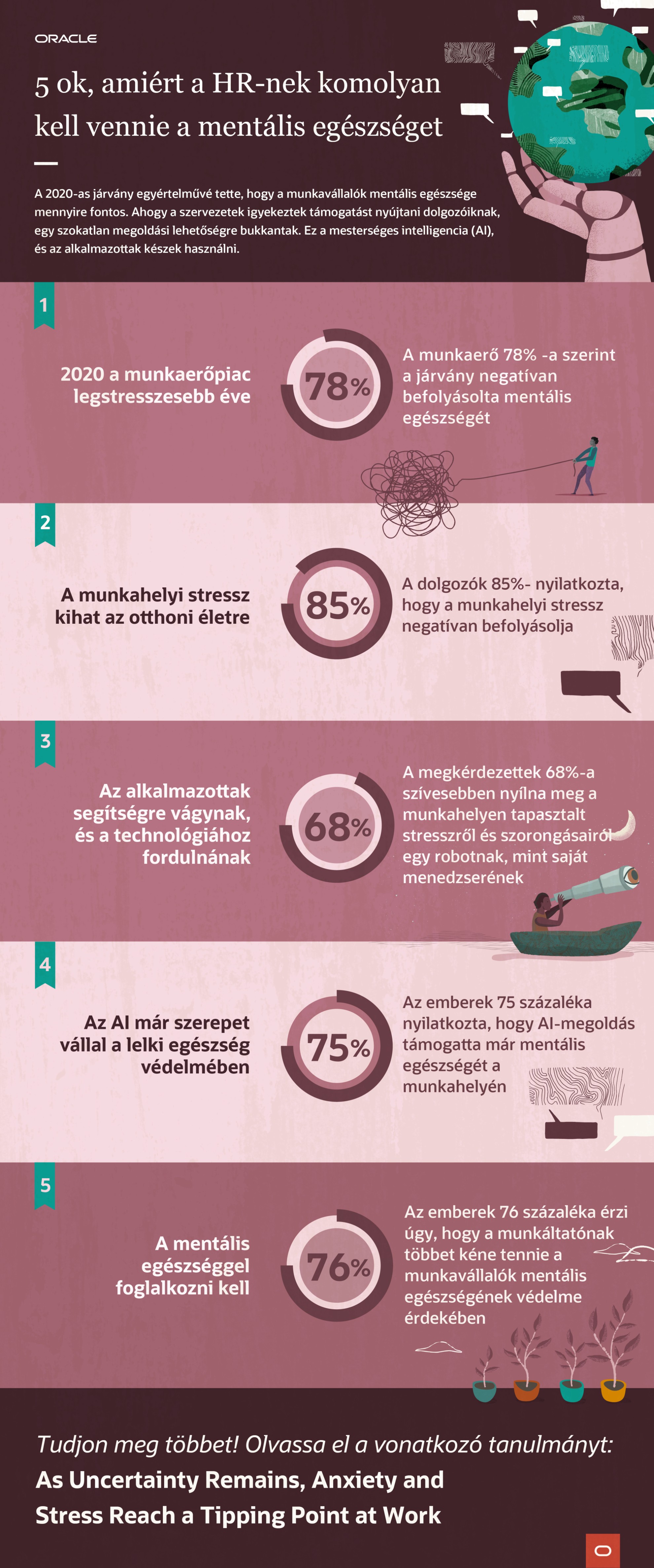 “A világjárvánnyal a mentális egészség nemcsak szélesebb társadalmi kérdéssé, hanem a munkahelyi kihívássá is vált. Mély hatással van az egyéni teljesítményre, a csapat hatékonyságára és a szervezeti produktivitásra. Most minden eddiginél jobban be kell kapcsolódnunk az ezzel kapcsolatos párbeszédbe. Az alkalmazottak elvárják, hogy a munkaadók lépjenek fel és nyújtsanak megoldásokat számukra” – mondta Emily He, az Oracle Cloud HCM vezető alelnöke. „Nagyon sokat lehet tenni a globális munkaerő mentális egészségének támogatása érdekében, és nagyon sokféle módon segíthet az olyan technológia is, mint az AI. De mindenekelőtt a szervezeteknek napirendre kell tűzniük a mentális egészség kérdését. Ha el tudjuk kezdeni ezt a párbeszédet – mind HR, mind ügyvezetői szinten – elkezdhetünk változásokat eszközölni. Én ennek most jött el az ideje.”