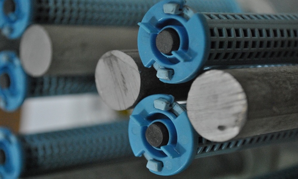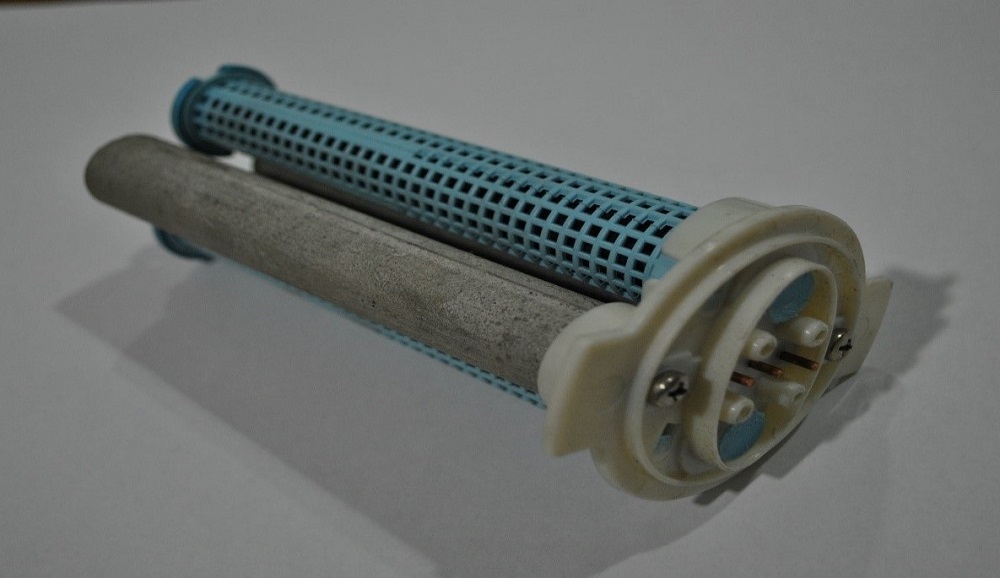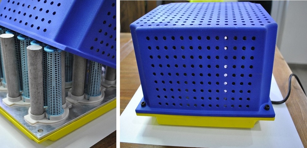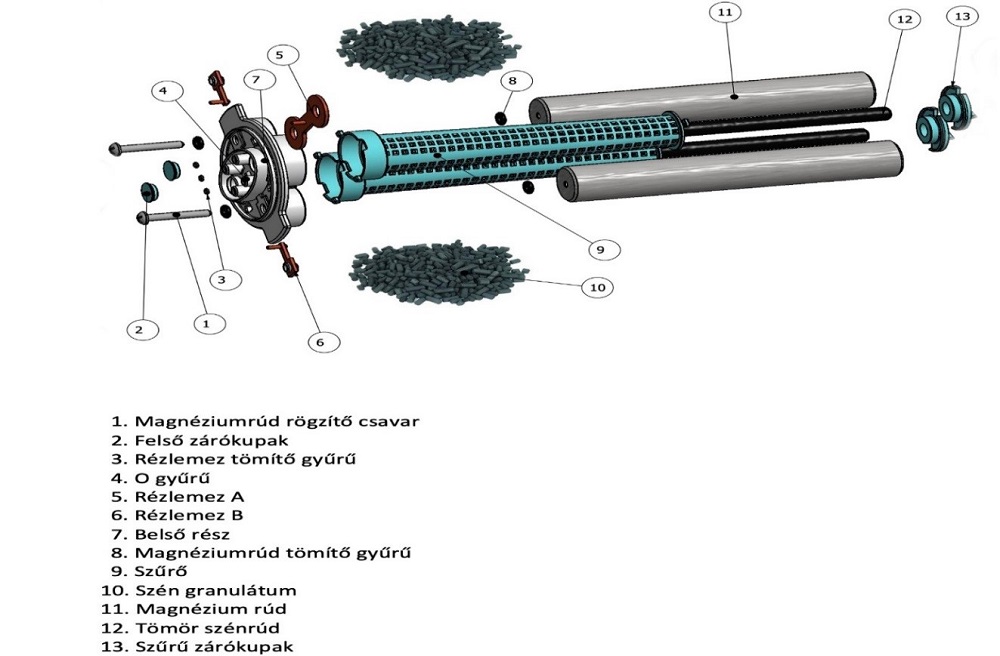 anód/katód anyag méret és elhelyezés: a magnézium rúd és a kék kosárban a szénrúd