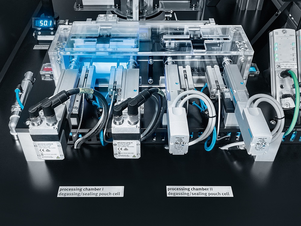 A gáztalanítás és a tömítés az akkumulátorcellák gyártásának alapvető folyamatai, amelyek közvetlenül követik az akkumulátorcellák első feszültség alá helyezését. Az akkumulátorcellákat lándzsákkal szúrják át és a bennük képződő gázt elszívják. A Festo pneumatikus és elektromos hajtásokat használ az akkumulátorcellák mozgatására, rögzítésére és átszúrására.