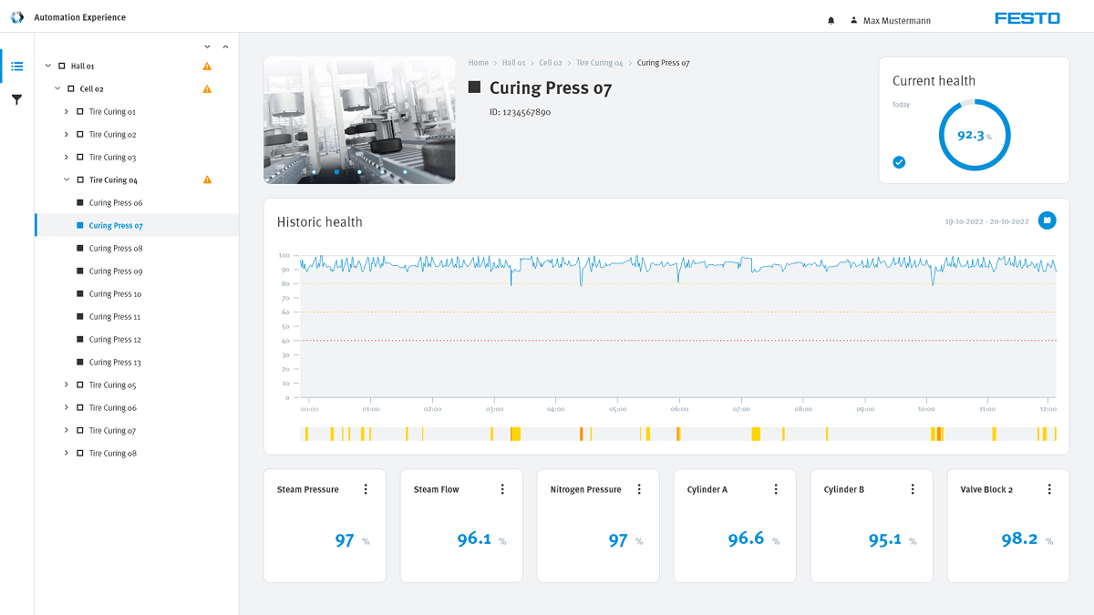 A vulkanizáló présben használt pneumatikus hajtómű tulajdonságainak, például a nyomásnak, a mozgási sebességnek és ezek időbeli alakulásának decentralizált felügyelete nemcsak a működtető egység paramétereinek elemzését teszi lehetővé, hanem a teljes folyamat rendellenességeinek felderítését is. Ez az alapja a prediktív karbantartási koncepcióknak és a gyártási folyamat optimalizálását célzó adatelemzéseknek. A vezérlés mesterséges intelligenciája további programozási erőfeszítés nélkül észleli a rendellenességeket.