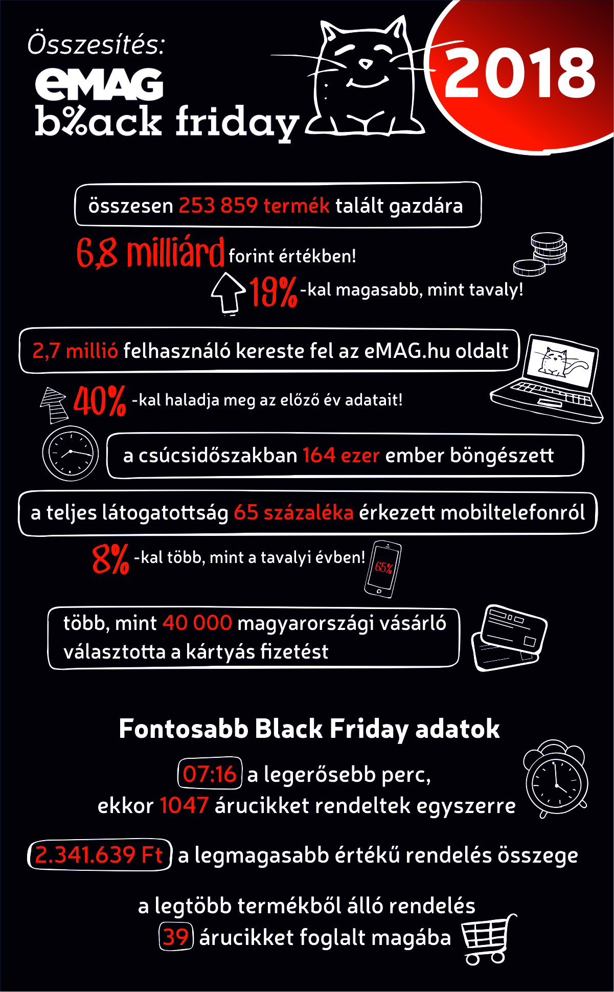 Az immár ötödik alkalommal megrendezett Black Friday-en, az év legjobban várt értékesítési eseményén az eMAG 6,8 milliárd forint értékben könyvelhetett el megrendeléseket Magyarországon, ami majdnem 19 százalékkal ugorja meg a tavalyi év Black Friday forgalmát. Az oldal 2,7 millió látogatót regisztrált, ami 40 százalékkal haladja meg az előző év adatait, a látogatók összesen 253.859 terméket rendeltek az oldalról, 27 százalékban a Marketplace-ről.