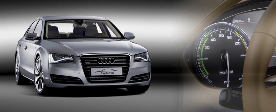 A hajtás mindenképp az első (a tanulmányon 21 colos, széles és alacsony oldalfalú, 265/35-ös abroncsokat hordó) kerekeké. Feltöltött akkumulátorokkal, legfeljebb 65 km/órás tempóval, akár több, mint 2 kilométeren keresztül csupán elektromosan, benzinmotorja nélkül mozoghat az A8 hybrid. Felette észrevétlenül kapcsolódik be a TSI, a gázpedálról lelépve ugyanígy le is áll, a fékezési energiát a villanymotor hasznosítja és továbbítja a csomagtérbe telepített lítium-ion akkumulátorokba. Utóbbiak 110 liternyi helyet foglalnak, de a poggyászoknak így is kereken 400 l marad.