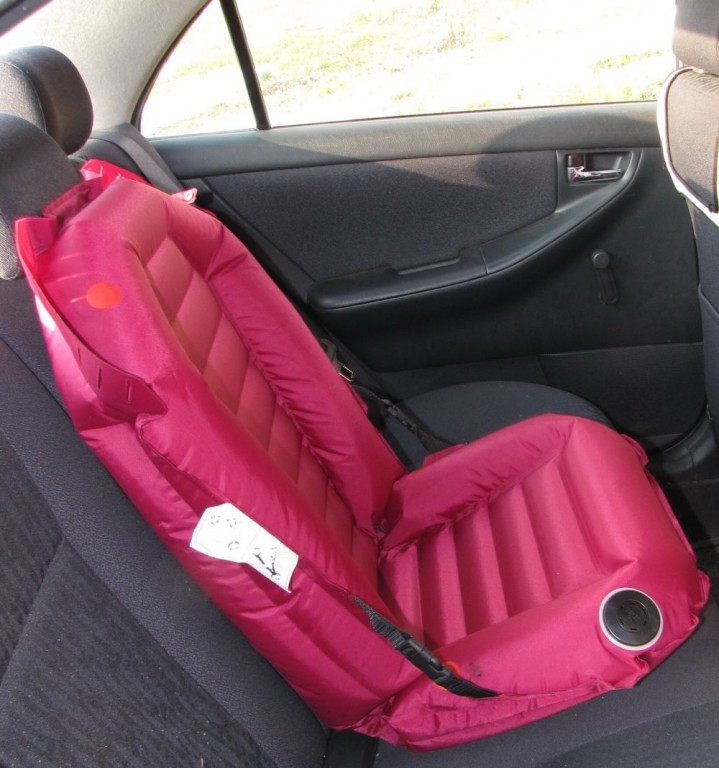 Európában és Magyarországon csak nemrég kezdték el forgalmazni ezt a felfújható terméket, amit a 15-36 kilós gyerekeknek javasol a gyártó, a csehországi Gumotex. Becsomagolva egy 80x330x340 mm külső méretű lapos táskában elfér, vagyis gyakorlatilag nincs helyigénye: betehetjük egy hátitáskába, az autó csomagtartójának egyik üregébe vagy az első ülések alá. Ez a tulajdonsága a gyakran utazó, több autót használó családoknak főnyeremény, de biztosan örülnek majd neki a nagyszülők is, hiszen végre elfelejthetik a kényelmetlen és bumfordi hagyományos biztonsági eszköz cibálását.