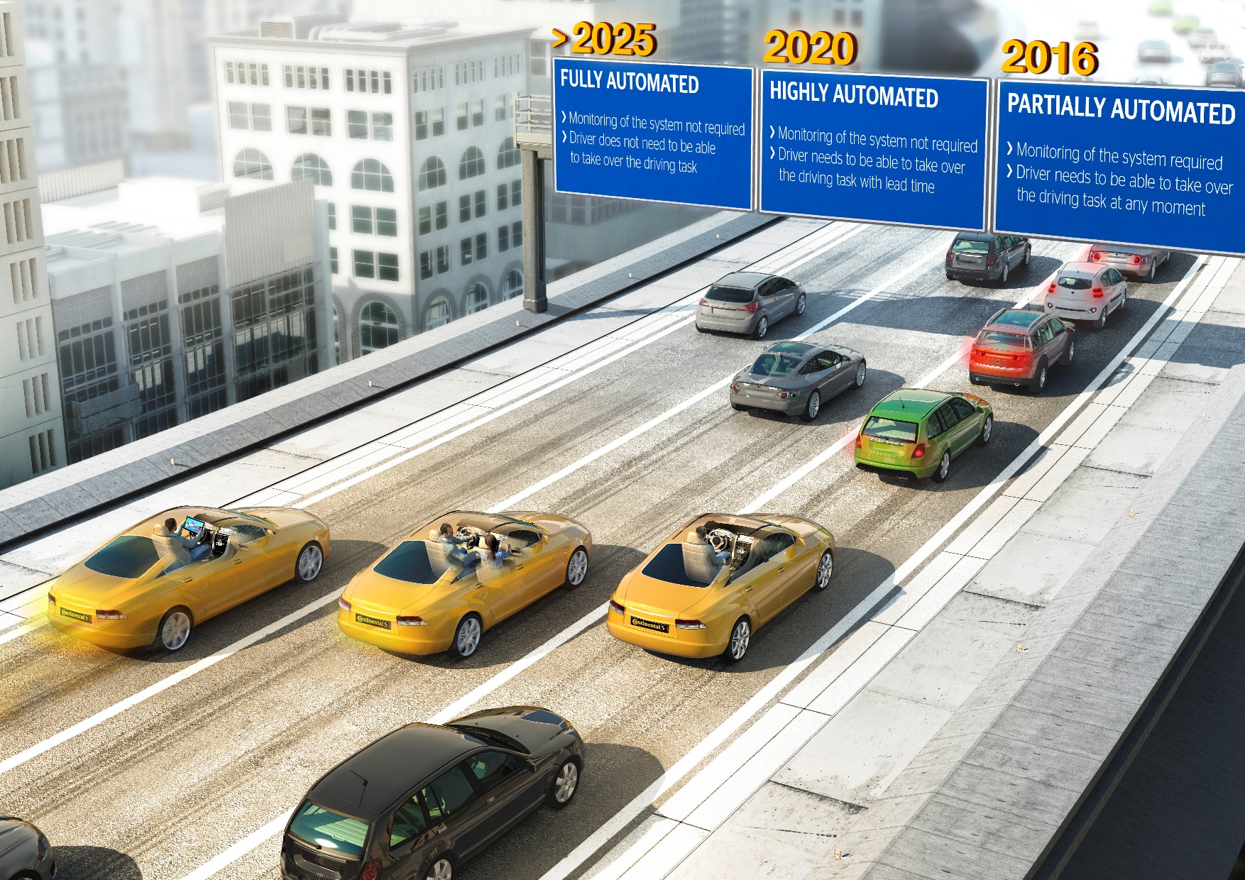 Vision Zero (zéró baleset), kényelmes vezetés, tiszta levegő – a jövő mobilitásában óriási lehetőségek rejlenek. A Continental, a világ egyik vezető autó-és gumiipari szereplője komoly erőfeszítéseket tesz az olyan rendszerek és megoldások kifejlesztése érdekében, amelyek elektronikus sofőrként funkcionálhatnak az autóvezetők számára. Például az országok közötti autópályákon való közlekedés során a nagymértékben automatizált vezetéssel idő szabadul fel a sofőr számára egyéb, nem a vezetéshez kapcsolódó feladatok elvégzésére, mialatt a kormány mögött ül. Azonban a nemzetközi jogi szabályozás jelenlegi állása alapján ez a forgatókönyv még nagyon messze van tőlünk.