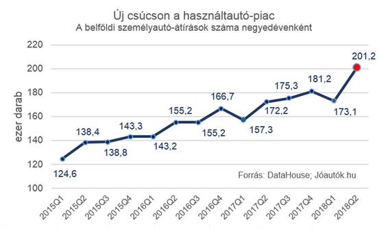2018 második negyedévében új csúcsra ért a hazai használtautó-piac: a gazdát cserélt használt személyautók száma az időszak során elérte a 201 ezret, ami 20 ezerrel magasabb a valaha mért legnagyobb értéknél. A belföldi átírások száma mind májusban, mind júniusban példátlanul magas szinten, 70 ezer közelében mozgott. Az év első felében összesen 374 ezer volt használtautó-piac forgalma, ami 14 százalékkal szárnyalta túl az előző év hasonló időszakának szintjét.